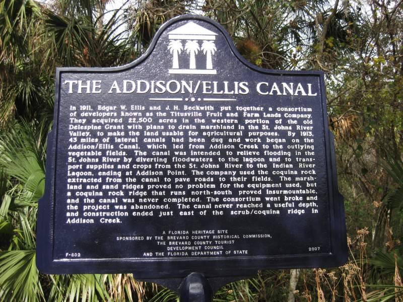 The 0.3 mile Coquina Trail crosses a bridge over the Addison Canal before turning west towards the Visitor Center. There are a number of places where you can almost stand on the edge and look down into the canal. It's quite a drop. This canal was dug between 1912 and 1913 in attempt to drain off the wetlands near the St. Johns River. Fortunately the thick coquina layer in this area put an end to that project. For more information see David Rich's Article on the Addison / Ellis canal.