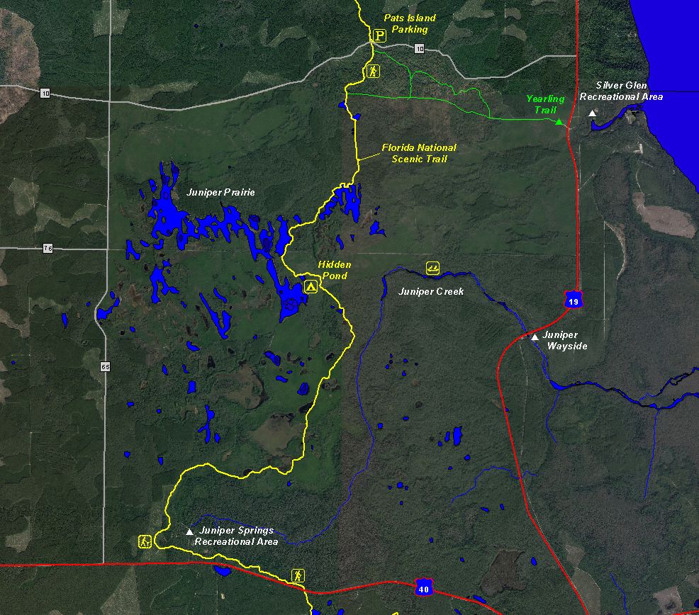 Probably the best trail to take is the Florida National Scenic Trail, which bisects this area starting from SR40 near Juniper Springs Recreation Area and runs north all the way to Pats Island Trailhead Parking on Forest Road 10. This 10.2 mile stretch of the trail will take you through some of the most scenic areas including the popular overnight backpackers' haven, Hidden Pond.