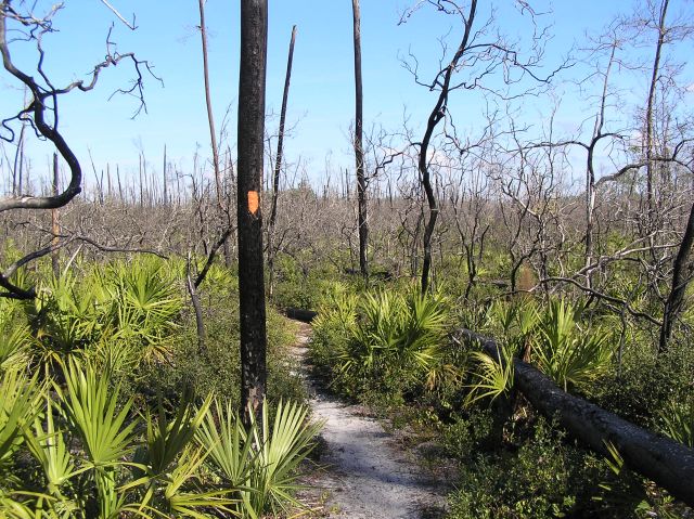 This area was hit badly by Hurricane Charley and several other storms back in 2004 causing numerous trees to fall down. To top it off, a prescribed fire in 2006 went out of control and burned nearly all 11,500 acres. The scrub and palmettos are already starting to come back, but it may be awhile before we see those huge sand pines towering over our heads again.