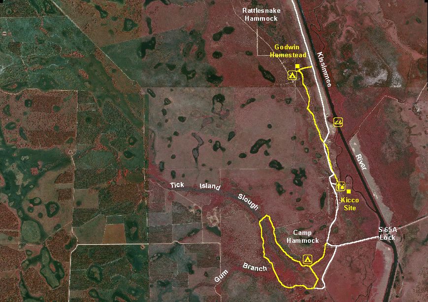 There is also one large campground located at the old Kicco Town site about 9 miles from the northern trailhead or 4.2 miles if you're hiking from the Avon Bombing range. There are plenty of picnic tables and fire rings available. Water can be obtained from the nearby Kissimmee River. Just make sure you treat it if you plan on drinking it.