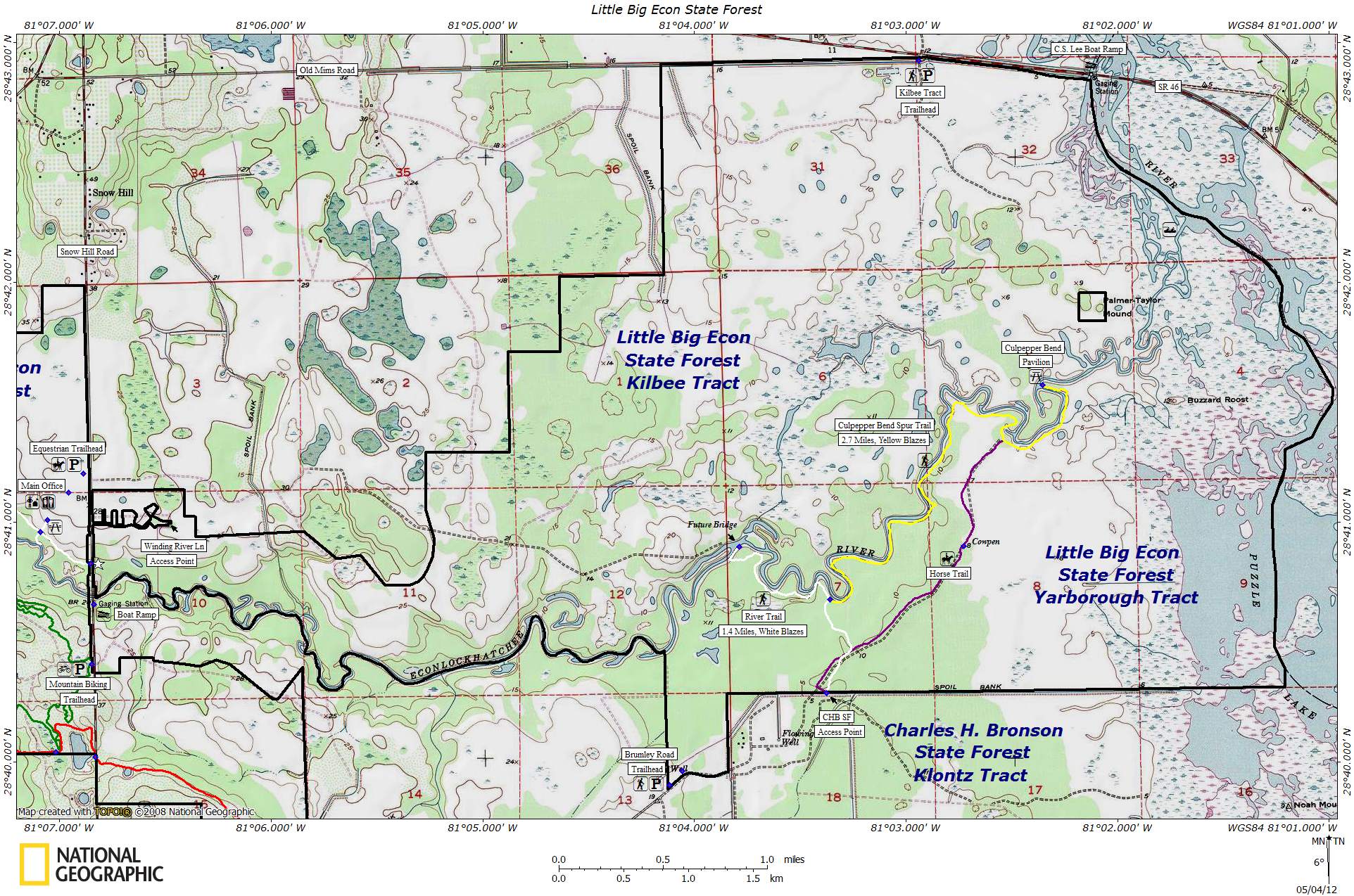 During the spring of 2012, a couple of new trails were added by the Florida Trail Association. A 12 mile, white-blazed hiking trail, known as the River Trail, now runs all the way from Orlando Wetlands Park, through the Charles H. Bronson State Forest, and ends at the Econlockhatchee River. A 2.75 mile, yellow-blazed, spur trail also provides access to a day-use pavilion located at Culpepper Bend. Both trails can be accessed from the Brumley Road Trailhead.