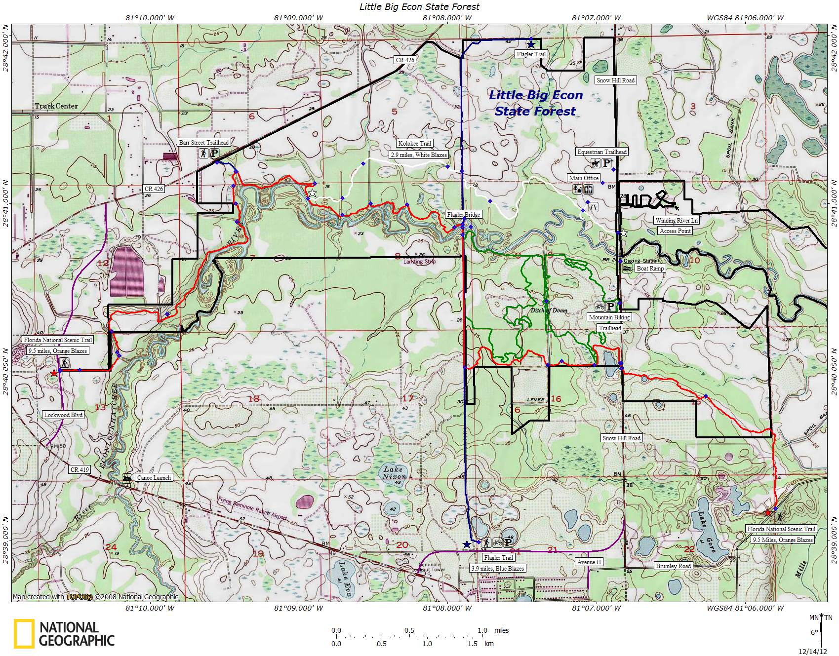 Another scenic trail is the 3 mile, white-blazed spur trail. It starts near the State Forest office on Snow Hill Road and passes a very nice boardwalk going out to the Econlockhatchee River. It then crosses the historic Flagler trail before merging with the Florida National Scenic Trail about a mile east of the Barr Street Trailhead.