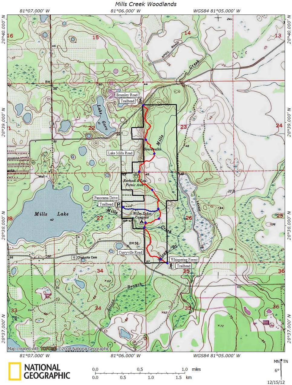A very nice primitive campsite is located a short distance from Mills Creek along the Florida National Scenic Trail. It is equipped with a fire ring, picnic table and several benches. The campsite was dedicated in 2011 to Wiley Dykes, Sr., a pioneer trail blazer for the Florida Trail Association. GPS coordinates: N28° 38.030 W81° 05.783.