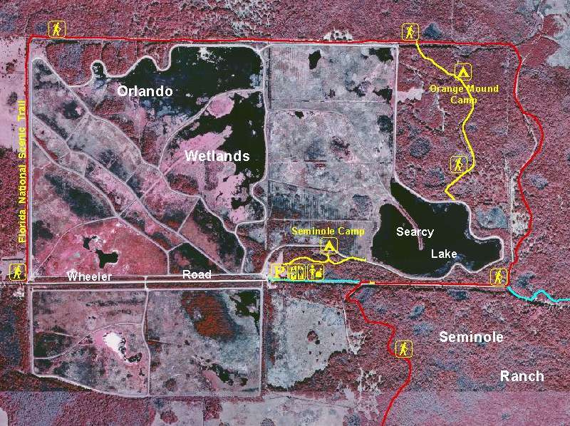 Color infrared aerial map of Orlando Wetlands showing hiking trails, camp sites and roads. Aerial photo was taken in 2000.