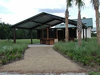 As of 2010 Orlando Wetlands no longer allows camping or cooking fires on the property. However there are still two marked campsites located just off the hiking trails. One, called Seminole Campsite, is located only a few minutes from the parking lot. It consists of a chickee (pictured above) and several benches. The other campsite site, called Orange Mound, is located in the north-eastern part of the property. Only a campsite sign can be found at this location.